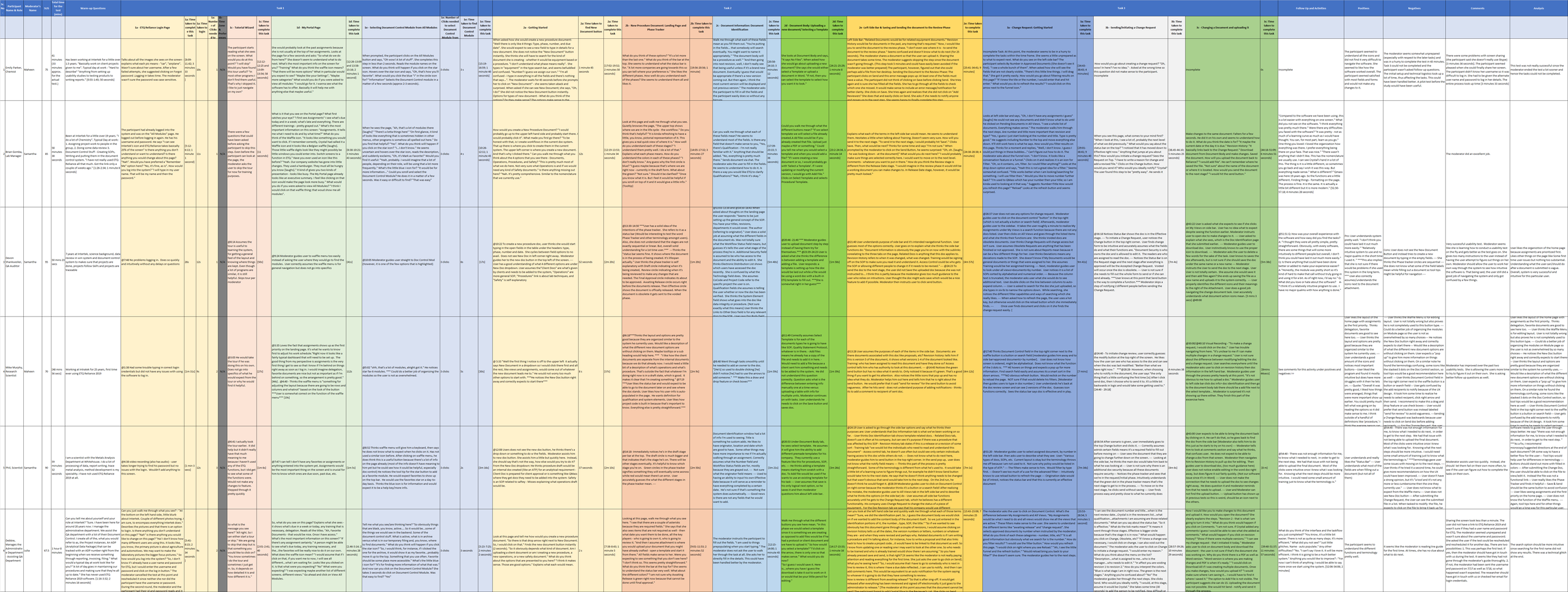 We organized the findings in an analysis spreadsheet. Every task was observed minutely and the time taken to complete it was recorded.